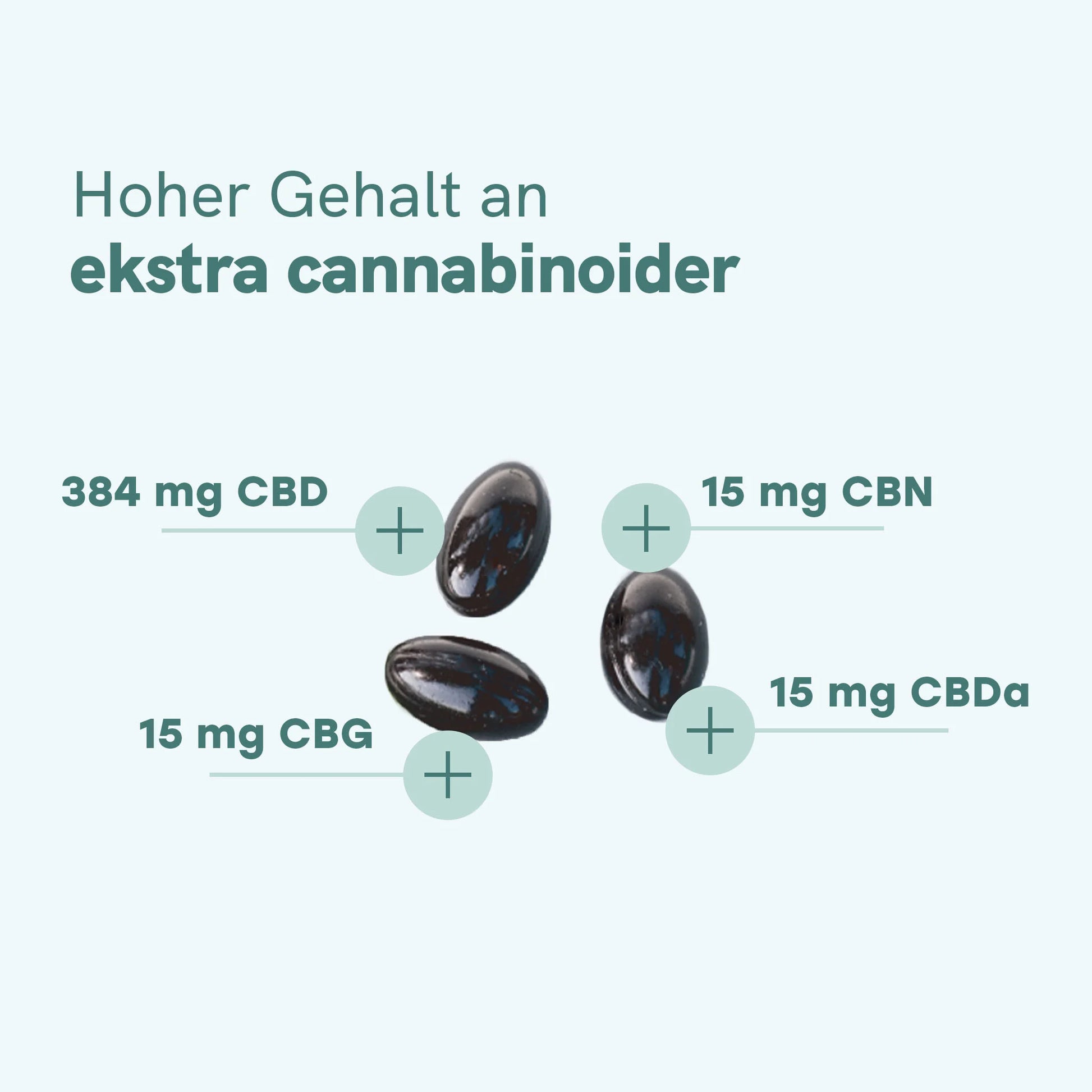 Ja, die Kapseln enthalten neben CBD (Cannabidiol) auch weitere natürlich vorkommende Cannabinoide. In jeder Verpackung sind zusätzlich zu den 384 mg CBD insgesamt 15 mg CBG (Cannabigerol), 15 mg CBDa (Cannabidiolsäure) und 15 mg CBN (Cannabinol) enthalten. Der THC-Gehalt liegt unter 0,02 % und ist somit nicht nachweisbar. Durch das verwendete Vollspektrum-Extrakt profitieren Sie vom sogenannten Entourage-Effekt: Die Kombination verschiedener Cannabinoide kann die Gesamteigenschaften des Produkts ergänzen und unterstützen.