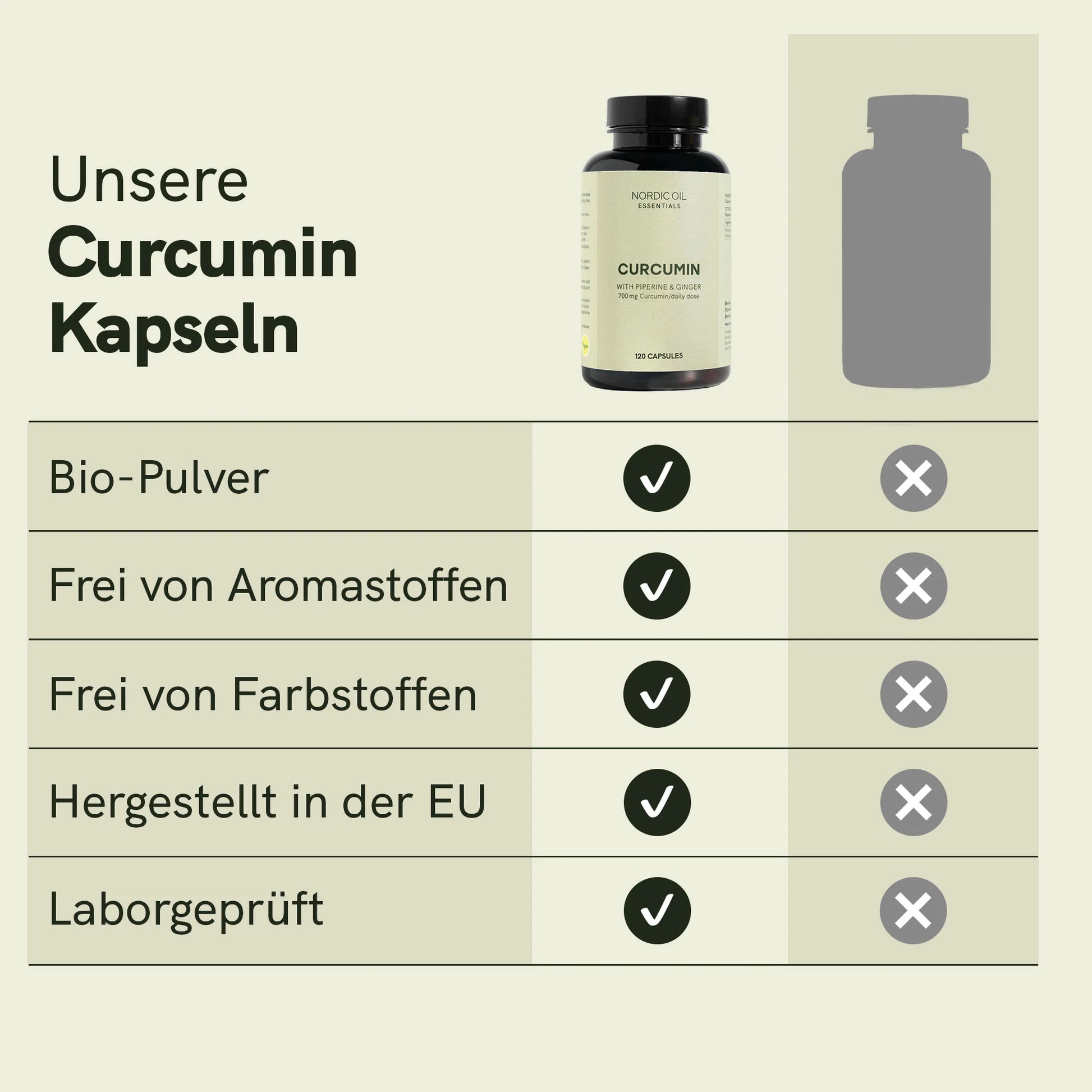 Unsere Curcumin Kapseln mit Piperin und Ingwer wurden sorgfältig entwickelt, um Ihr Wohlbefinden zu fördern, indem sie 700 mg Curcumin, 9 mg Piperin und 5 mg Ingwer pro Tagesdosis für eine optimale Aufnahme und synergistische Vorteile kombinieren. Mit 120 Kapseln pro Packung passt dieser 2-Monats-Vorrat perfekt in Ihre Routine: nur 2 Kapseln täglich. Frei von Konservierungsstoffen, künstlichen Aromen und Farbstoffen; außerdem ohne Soja, Sesam, Zucker, vegan und alkoholfrei – geeignet für zahlreiche Ernährungsweisen. Erleben Sie die Einfachheit und Reinheit unserer Curcumin Kapseln und integrieren Sie sie in Ihre tägliche Gesundheitsroutine.