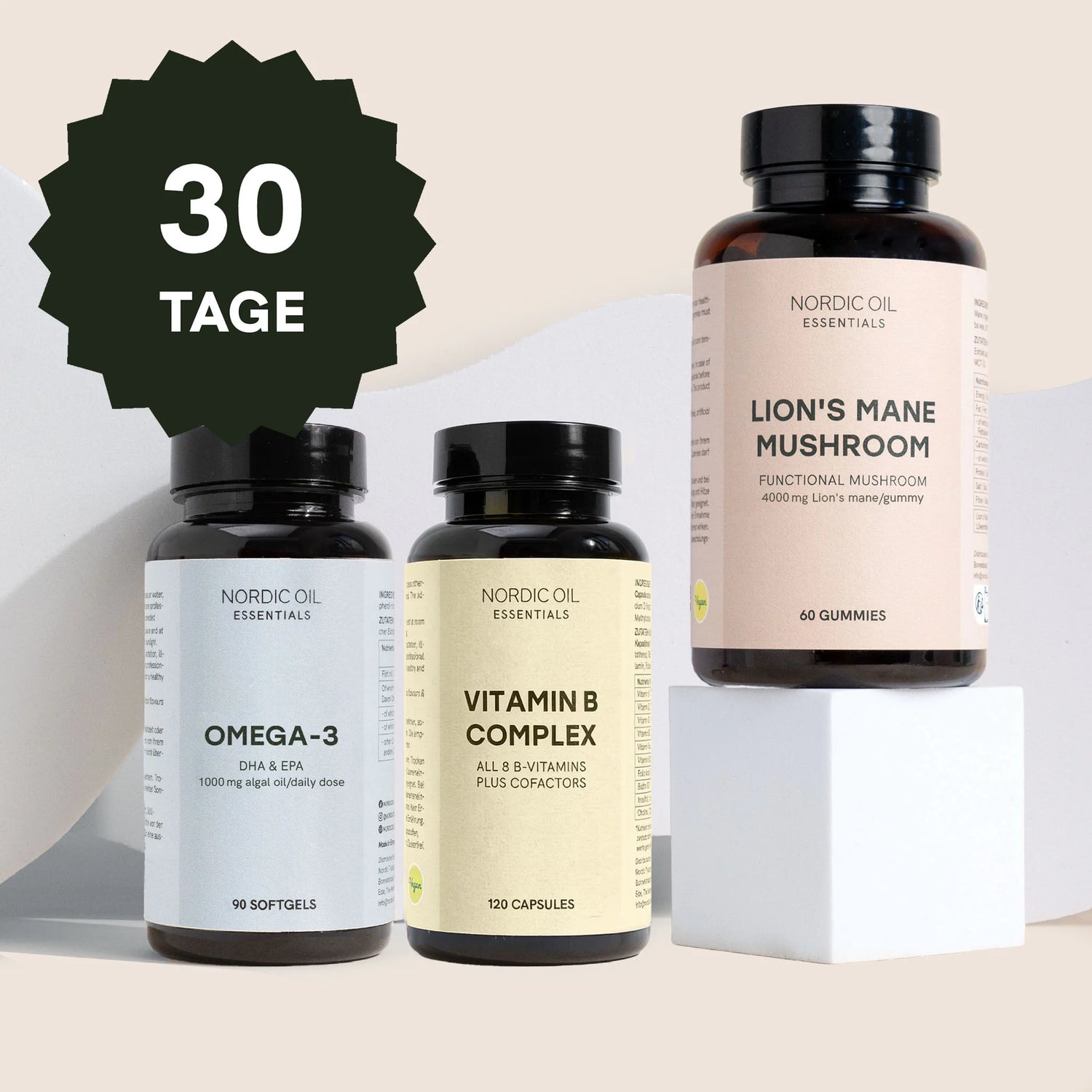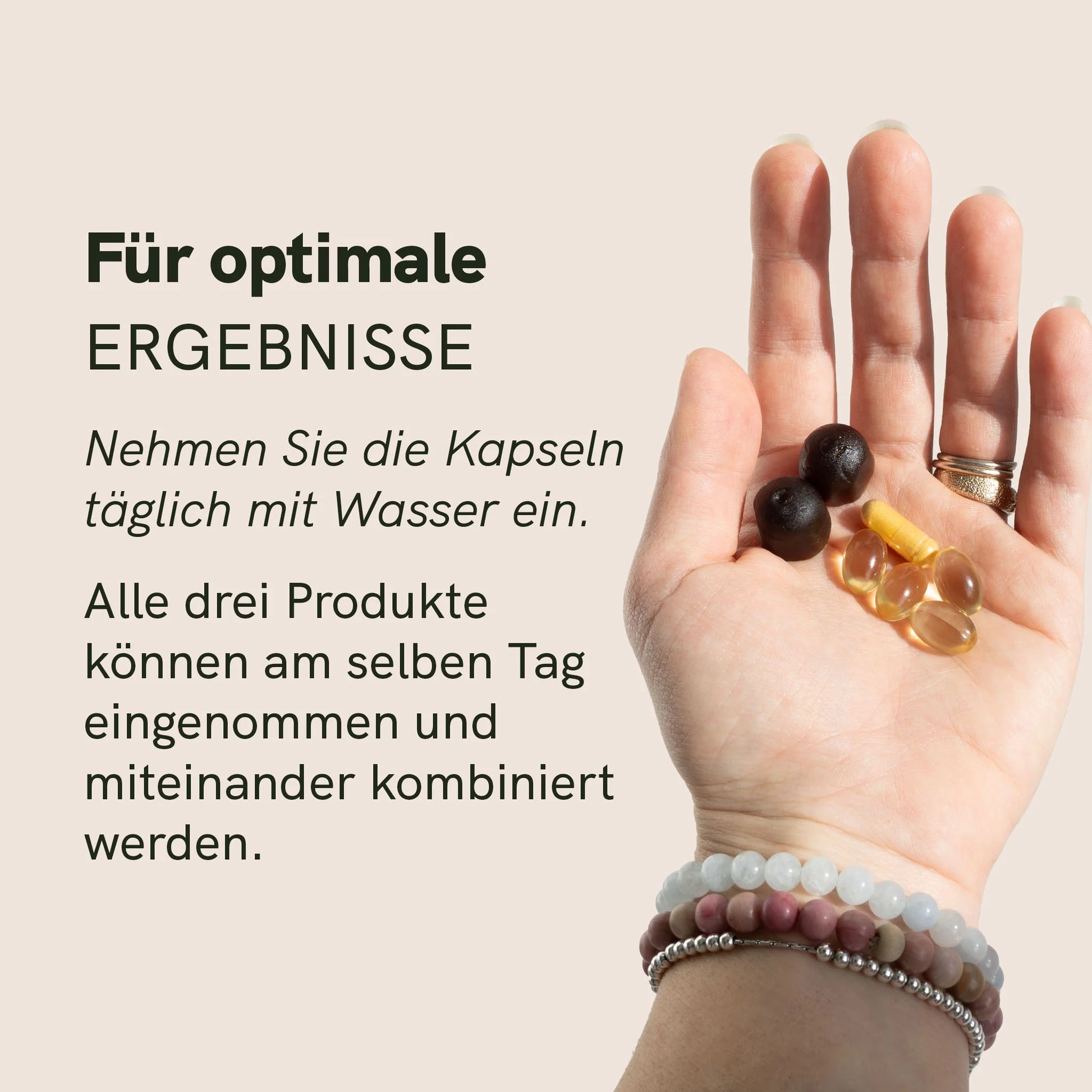 Hinweis zur Kombination: Alle drei Produkte können am selben Tag kombiniert werden. Für eine gleichmäßige Versorgung über den Tag hinweg empfiehlt sich die aufgeteilte Einnahme am Morgen und Mittag.