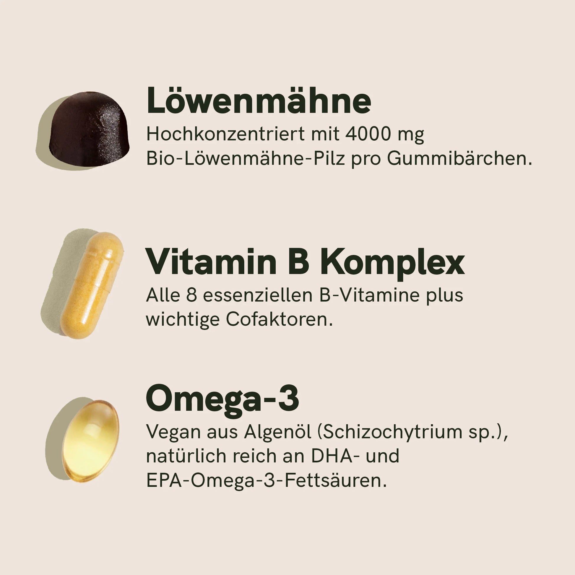 Löwenmähne Gummies:Maltitolsirup, Sorbitol, Wasser, Pektin, Zitronensäure, Bio-Löwenmähne-Extrakt, Pilzaroma, Rapsöl, Stärke, Carnaubawachs, MCT-Öl.