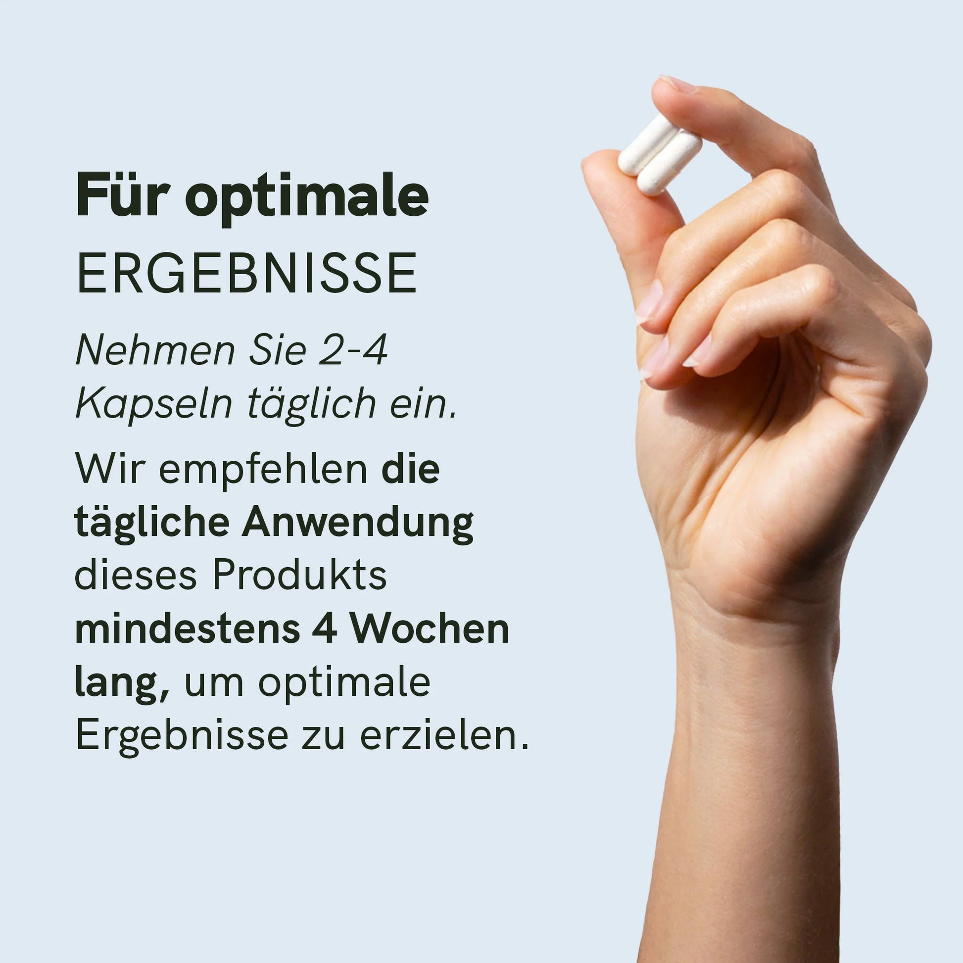 Nehmen Sie 2 bis 4 Kapseln zweimal täglich mit einem Glas Wasser ein, sofern nicht anders von Ihrem Arzt empfohlen. Die empfohlene Tagesdosis darf nicht überschritten werden.