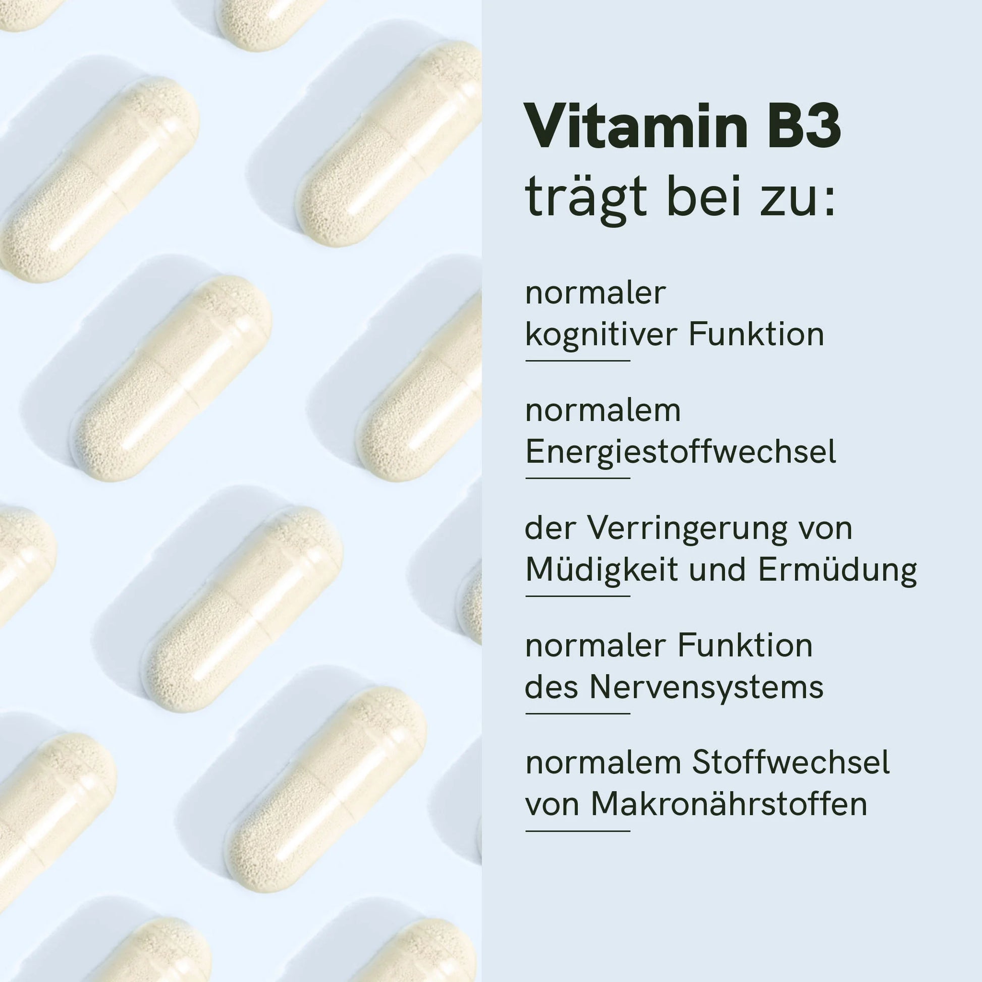 Vitamin B3 (Nicotinamid) trägt zu einer normalen psychischen Funktion bei und hilft, Müdigkeit und Erschöpfung zu reduzieren. Zudem unterstützt es die normale Funktion des Nervensystems.
