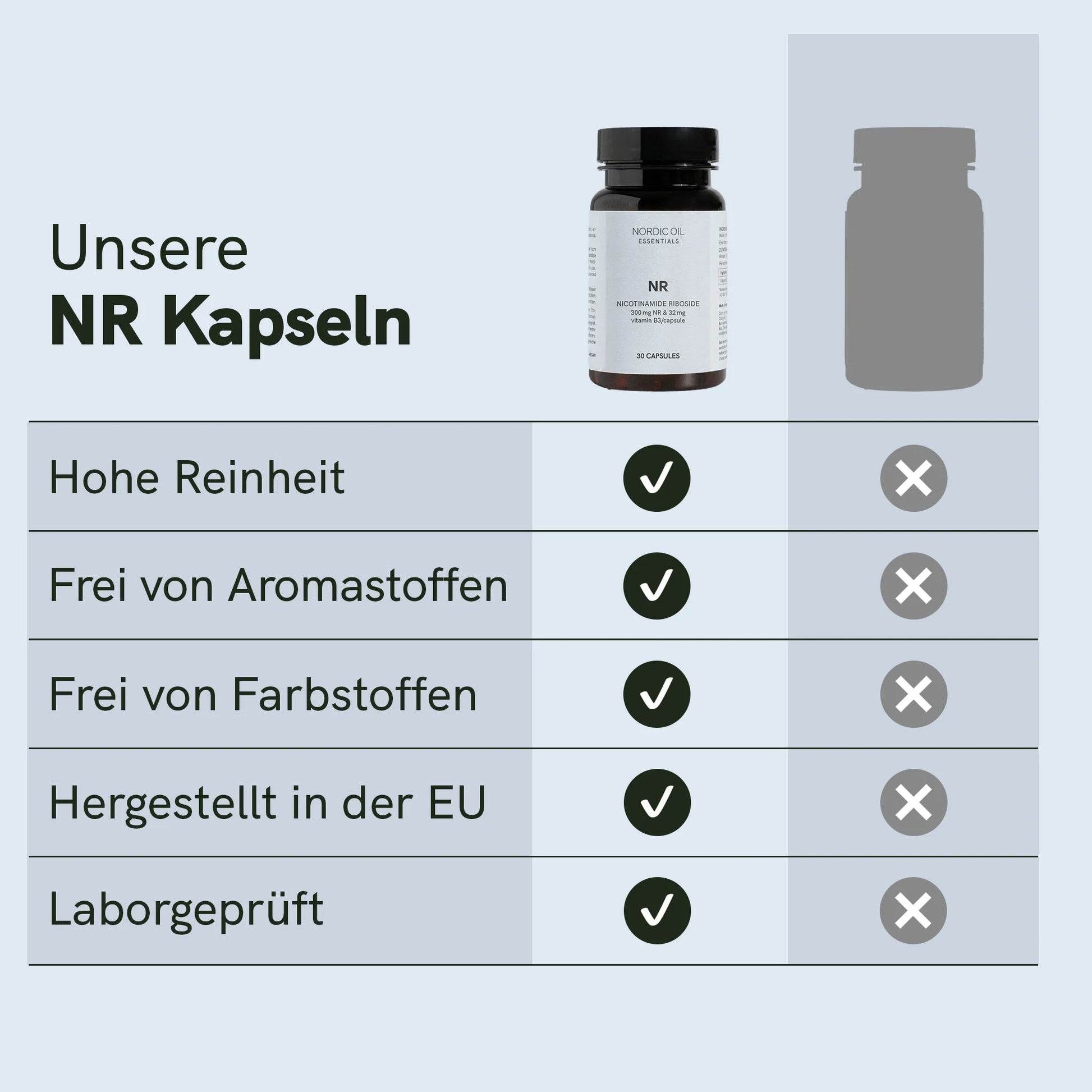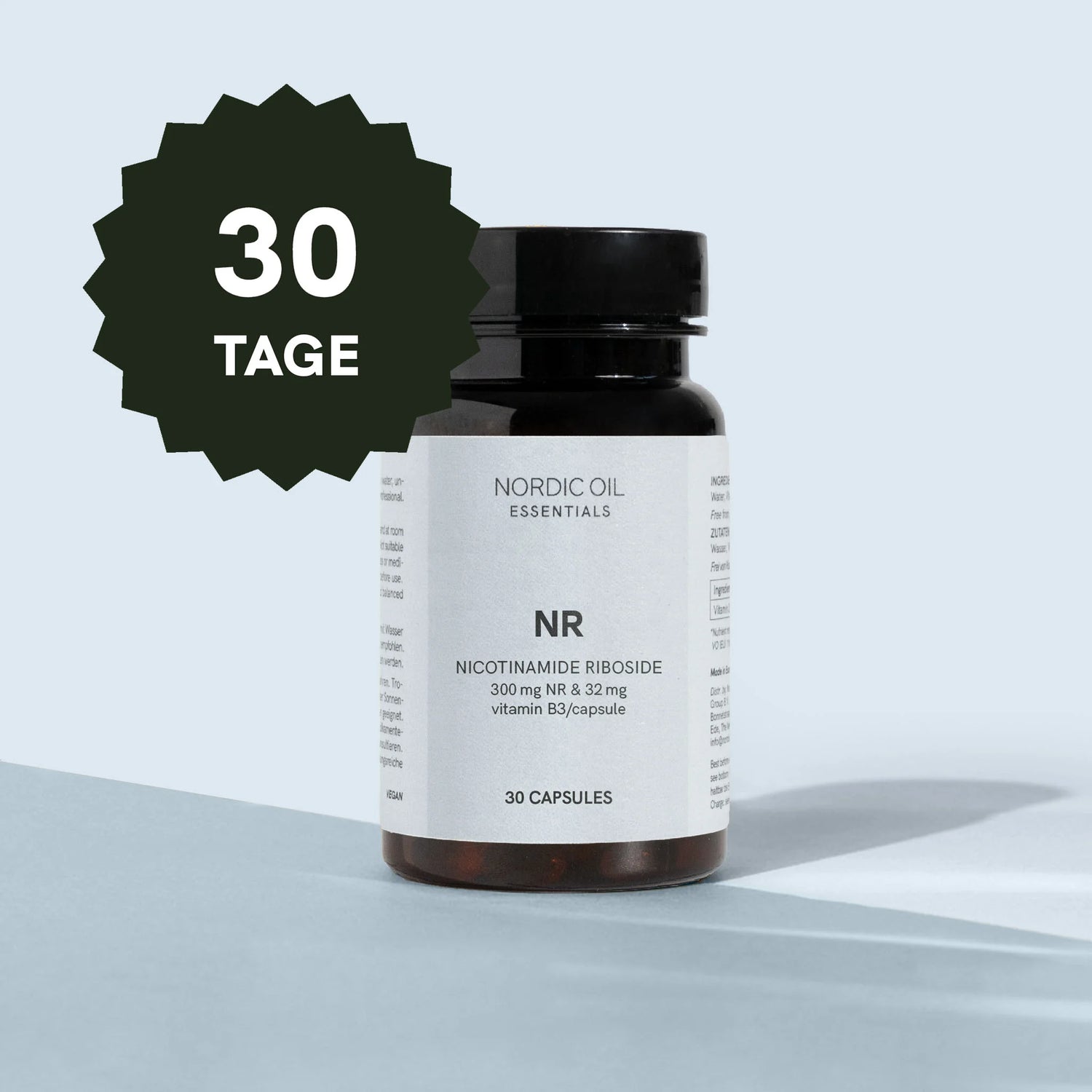 Die Nicotinamid-Ribosid (NR) Kapseln sind vegan, zuckerfrei, glutenfrei, in der EU hergestellt und unabhängig laborgeprüft. Jede Packung enthält 30 Kapseln — eine Monatsversorgung für Ihre Longevity‑Routine.