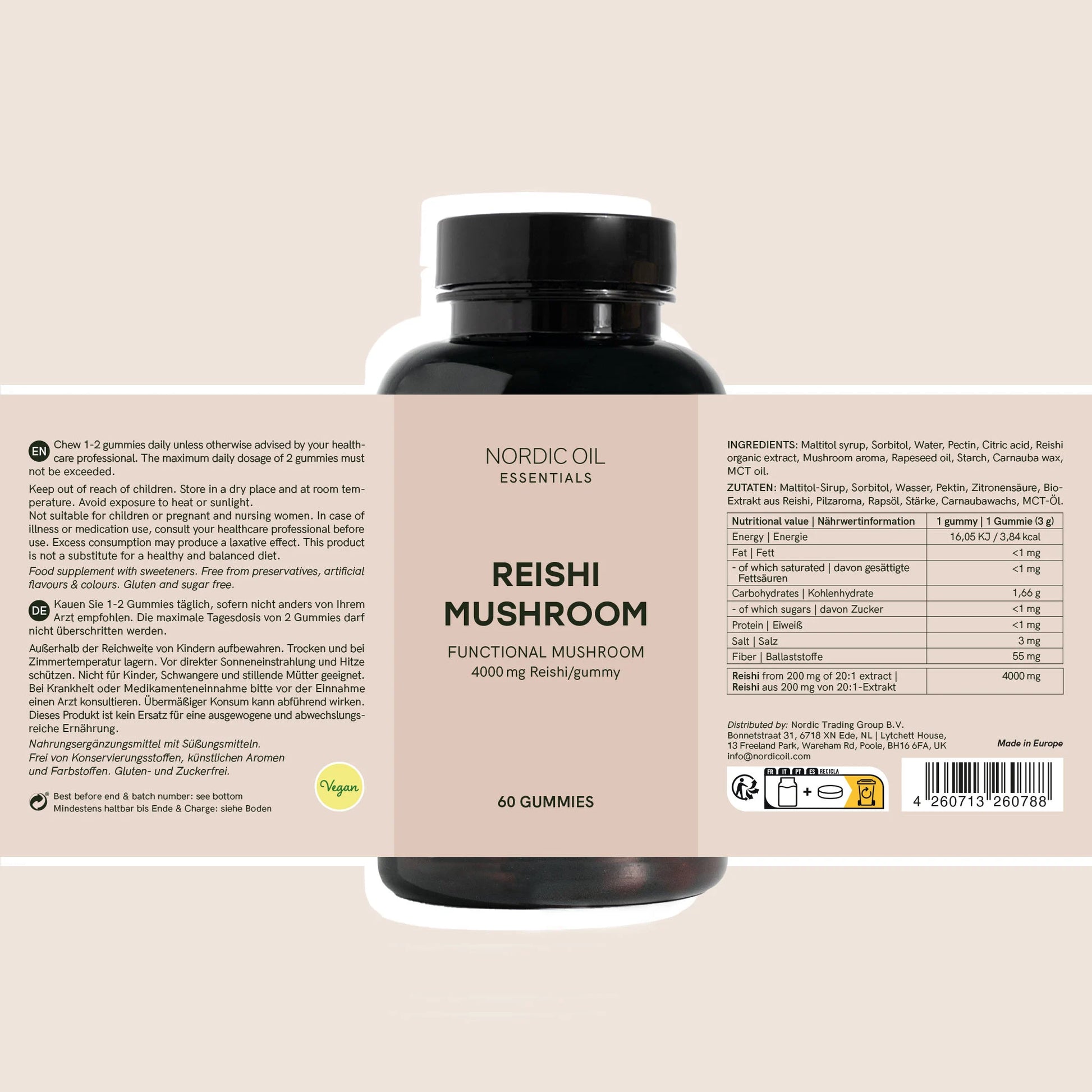 Maltitolsirup, Sorbit, Wasser, Pektin, Citronensäure, Bio-Reishi-Extrakt, Pilzaroma, Rapsöl, Stärke, Carnaubawachs, MCT-Öl.